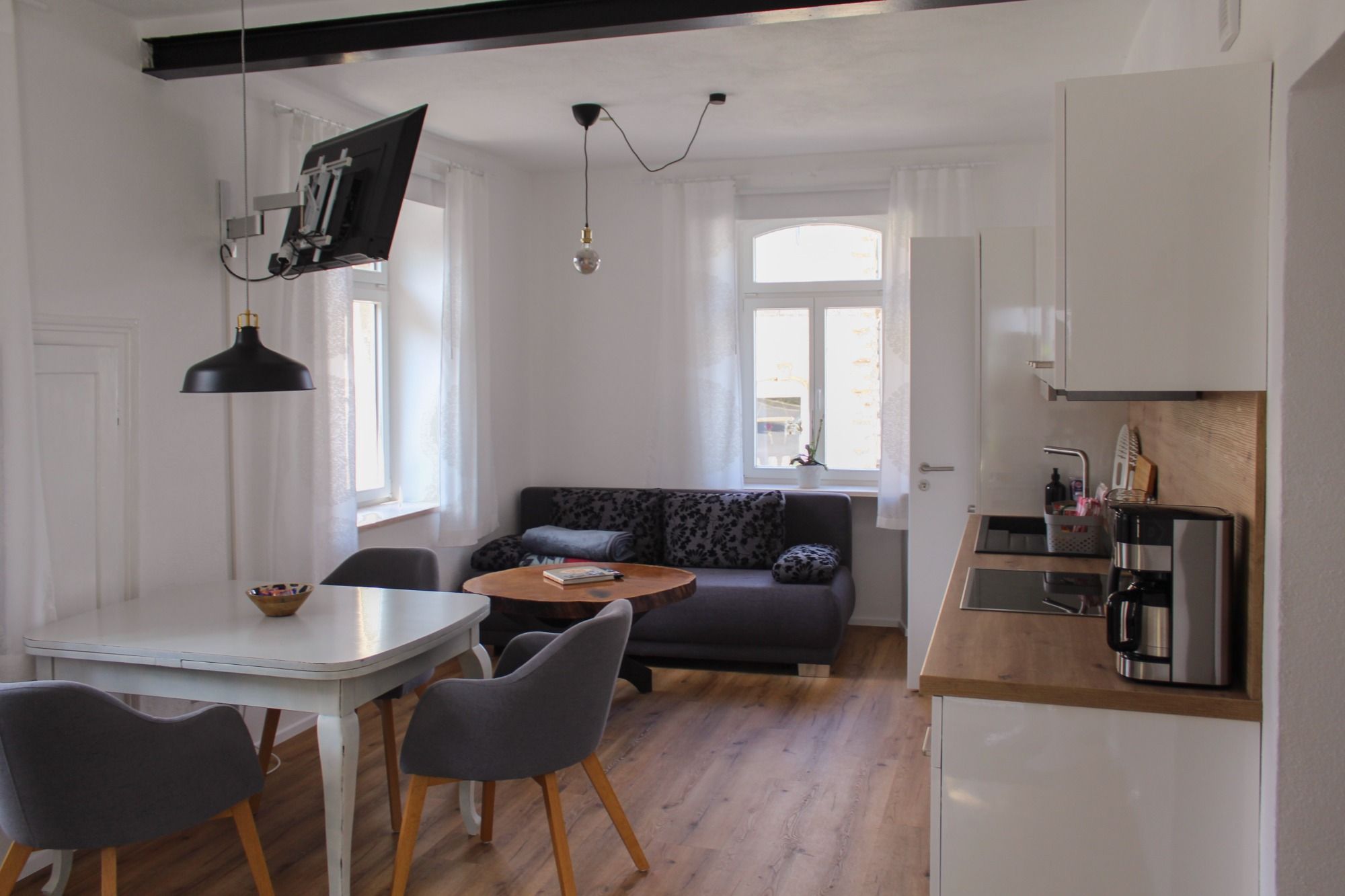 Sie treten ein und befinden sich im Herzen der Wohnung, in einem hellen und lichtdurchfluteten großzügigen Wohnbereich. Hier befindet sich eine großzügig ausgestattete moderne Küche, der Essbereich und eine Couch zum Entspannen.